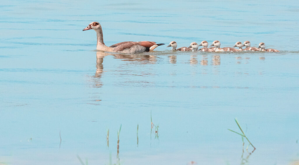 2de plaats Foto 3: Corine Minous Vanderhelstraeten Een teder fragment in pastel: een nijlgans die haar kroost rustig over het stille water leidt. De zachte kleuren en serene compositie ademen rust en vertrouwen, een poëtisch beeld van zorg en samenzijn.