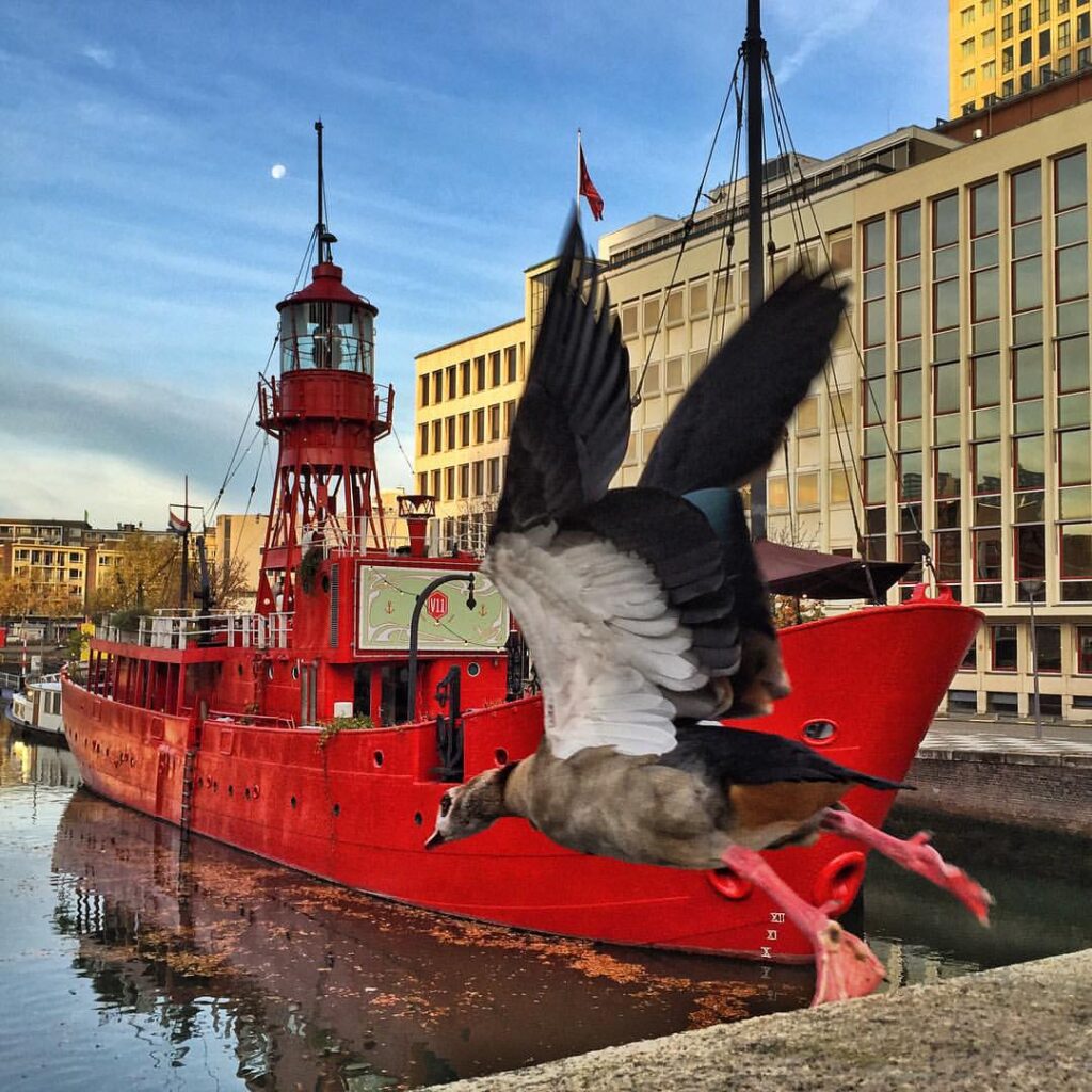 4de plaats Foto 5: Gaby Helfert Deze foto valt meteen op door de originele setting: een nijlgans vastgelegd in volle vlucht, pal voor een felrood schip in een stedelijke haven. Het contrast tussen natuur en stadselementen maakt dit bijzonder en verassend.